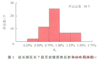 延長(zhǎng)探區(qū)長(zhǎng)7段頁巖埋深變化大(500~1800m)、構(gòu)造演化歷史和熱作用歷史存在差異,其現(xiàn)今的熱成熟度變化亦較大。長(zhǎng)7段頁巖的鏡質(zhì)體反射率變化范圍為0.25%~l.50%,基本上涵蓋了生物作用生甲烷氣、熱降解作用生油氣和高溫?zé)崃呀馍鷼?span lang="EN-US">3個(gè)生烴階段,但以熱降解作用階段為主(圖1)。因此,從成因類型上看,長(zhǎng)7段頁巖氣包括生物作用成因、熱降解成因和高溫?zé)崃呀獬梢?span lang="EN-US">3種類型。