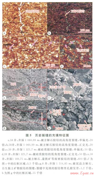 頁巖不但是頁巖氣的烴源巖和儲(chǔ)層,超低的孔滲性還使得頁巖可成為頁巖氣的蓋層[13-14]。但這并非表明頁巖氣的賦存對(duì)蓋層條件沒有嚴(yán)格要求。在孔滲條件較優(yōu)越地區(qū),蓋層條件可能是需要上覆蓋層。例如美國(guó)的Barnett頁巖其上覆“蓋層”為石灰?guī)r[10]。對(duì)于孑L滲條件差但裂縫發(fā)育的地區(qū),蓋層條件則是裂縫需要被充填。以長(zhǎng)7段頁巖為例,部分頁巖裂縫極其發(fā)育,但裂縫并沒有破壞其含氣性,原因在于一些裂縫被高度充填,阻止了氣體的二次運(yùn)移。長(zhǎng)7段頁巖的裂縫膠結(jié)物包括方解石膠結(jié)物(正交光下顯示高級(jí)干涉色,圖5-a、5-b)和硅質(zhì)膠結(jié)物(正交光下顯示一級(jí)灰干涉色,圖5-c、5-d)。被嵌晶連晶方解石或硅質(zhì)膠結(jié)物充填的裂縫較致密、結(jié)晶較大、晶形完整,膠結(jié)礦物主要為碳酸鹽類,以方解石為主,局部見菱鐵礦,可見自生黏土礦物充填晶間縫(圖5-e、5-f)。被泥晶方解石和黏土礦物充填的裂縫較疏松,膠結(jié)物中發(fā)育晶間孔孔隙,泥晶方解石膠結(jié)物大小介于5~10mm,自生黏土礦物晶體大小介于l~2mm(圖5-g、5-h)。
