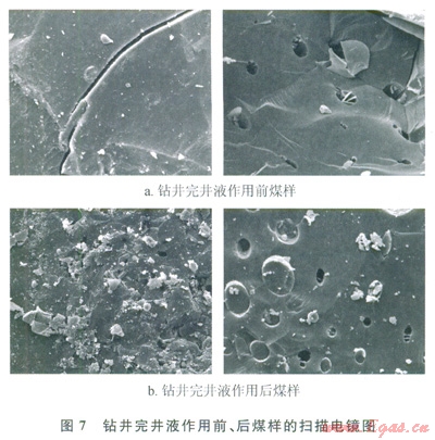 煤巖儲層鉆井過程中在正壓差作用下,鉆井完井液濾液將侵入煤層,當鉆井完井液濾液與煤層流體小配伍時,在煤層溫度、壓力、pH值等條件的作用下極易產(chǎn)生沉淀物。鉆井完井液固相和產(chǎn)生的沉淀物將堵塞煤層裂縫和孔隙,導致煤巖儲層滲透性降低。圖7為鉆井完井液作用前后煤樣掃描電鏡結(jié)果,可見鉆井完井液未作用煤樣孔隙和裂縫未被充填,具有較好的連通能力,而鉆井完井液作用后煤樣裂縫和孔隙均被不同程度充填,尤以裂縫充填最為嚴重,大大降低了原有的連通能力,使?jié)B透率顯著下降。