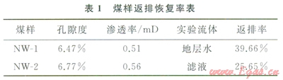 煤巖具有高毛細管壓力特征,鉆井完井液濾液與煤層接觸后在毛細管力的作用下將發(fā)生毛細管自吸,使煤層含水飽和度增加,氣相滲透率降低,并導致后期排采作業(yè)中鉆井完井液濾液長時間難以完全返排。為了掌握煤巖對鉆井完井液濾液的毛細管自吸特征,開展了相同滲透率級別煤樣的地層水和鉆井完井液濾液毛細管自吸實驗和模擬排采過程的氣驅(qū)水返排實驗[14]。實驗結(jié)果(圖3)表明,自吸曲線初始階段白吸速率很快,液相在毛細管力作用下迅速自吸進入裂隙和大孔中,隨著時間的增長白吸速率逐漸下降,液相以擴散吸附的方式進入微孔,相同時間內(nèi)鉆井完井液濾液的白吸量高于地層水的自吸量。通過氣相返排實驗結(jié)果(圖3和表l)可以看出滲透率級別相近條件下地層水的返排率明顯高于鉆井完井液濾液的返排率,表明鉆井完井液濾液的吸附滯留將嚴重影響煤樣的返排能力,導致氣相滲透率的顯著降低。