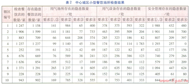自2012年11月山西壽陽(yáng)火鍋店發(fā)生燃?xì)獗ㄊ鹿屎?,武漢市立即開展對(duì)餐飲場(chǎng)所的用氣安全檢查。按武漢市出臺(tái)的《商用燃?xì)庠罹咴O(shè)施安裝及驗(yàn)收技術(shù)規(guī)程》(以下簡(jiǎn)稱《規(guī)程》)的規(guī)定,使用管道氣的餐飲場(chǎng)所在通氣前須進(jìn)行驗(yàn)收,且管道氣供氣單位須定期上門對(duì)用氣場(chǎng)所進(jìn)行安全檢查。因此,此次用氣安全檢查的重點(diǎn)是使用瓶裝氣的餐飲場(chǎng)所。根據(jù)GB 50028—2006《城鎮(zhèn)燃?xì)庠O(shè)計(jì)規(guī)范》、CJJ 94—2009《城鎮(zhèn)燃?xì)馐覂?nèi)工程施工與質(zhì)量驗(yàn)收規(guī)范》、《規(guī)程》等對(duì)瓶裝氣用氣場(chǎng)所提出的安全要求,制定了餐飲場(chǎng)所用氣安全檢查的內(nèi)容及要求(見表l)。
