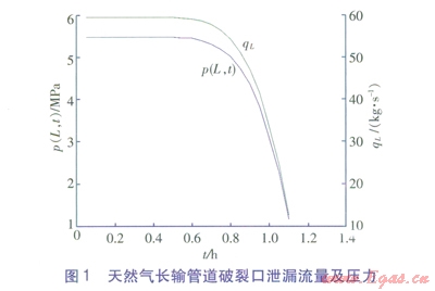 ②由于管道中天然氣的高壓,在泄漏的前一段時(shí)間,破裂口前壓力和泄漏質(zhì)量流量改變都很小。經(jīng)歷一段時(shí)間后,兩者都急劇下降。