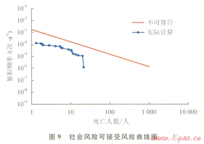 歐美等一些國家和石油天然氣企業(yè)已經(jīng)建立有自己的風(fēng)險可接受標(biāo)準(zhǔn)。我國于2011年國家安全生產(chǎn)監(jiān)督管理總局頒布了《危險化學(xué)品重大危險源監(jiān)督管理暫行規(guī)定》,制定了危險化學(xué)品重大危險源的風(fēng)險可接受標(biāo)準(zhǔn),除此以外沒有一個統(tǒng)一的或行業(yè)的風(fēng)險可接受標(biāo)準(zhǔn)。因此,筆者所在公司自2009年就開展了高含硫氣田開發(fā)風(fēng)險可接受標(biāo)準(zhǔn)的研究,并提出了公眾個人風(fēng)險標(biāo)準(zhǔn)(0.8×10-4),員工個人風(fēng)險(1.5×10-3)和社會風(fēng)險[1.4×10-3(N=1),斜率取-1]基準(zhǔn)值以供參考。