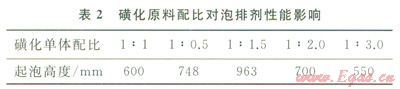 在最優(yōu)酯化反應(yīng)條件下,改變亞硫酸氫鈉:聚醚琥珀酸酯的配比合成泡排劑,磺化原料配比對泡排劑性能影響結(jié)果如表2所示。
