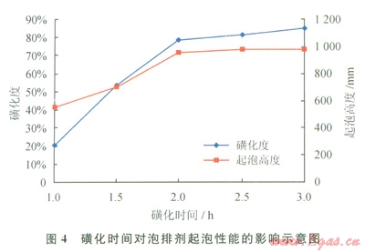 從圖4可以看出,隨著磺化時(shí)間增加,磺化度、起泡高度均增加,當(dāng)磺化時(shí)間超過2h時(shí),磺化度及起泡高度均變化不大。因此,可以選擇磺化時(shí)間為2h。