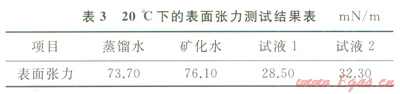 參考標(biāo)準(zhǔn)SY/T5370—1999配制礦化水(稱取10g氯化鈣和40g氯化鈉,用蒸餾水于燒杯中溶解,并用蒸餾水沖洗3次,沖洗液全部轉(zhuǎn)入該容量瓶中,加蒸餾水至總體積1000mL,得到礦化度50g/L的礦化水)、試液1(0.3%蒸餾水泡排劑溶液)、試液2(0.3%礦化水泡排劑溶液)。分別測定蒸餾水、礦化水、試液1、試液2的表面張力(表3)。