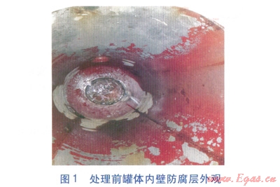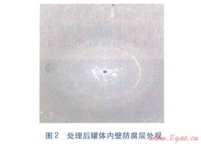 對于腐蝕穿孔情況,經(jīng)過實踐研究,我們總結(jié)了較為理想的處理方法,獲得了良好的效果。具體步驟為:對出現(xiàn)腐蝕穿孔的罐體拆卸后進行打磨,除去罐體內(nèi)壁銹斑及破損的防腐層。然后對穿孔部位進行同材質(zhì)補焊,并將焊渣打磨干凈,將適量的LG-001、LG-002防腐劑按比例混合后進行防腐層涂敷處理,最后進行烘干,如此重復(fù)兩次即可達到良好的防腐效果。該防腐技術(shù)為無毒、食品級防腐新技術(shù),成品表面強度高、彈性好,且表面光滑,抗機械損傷能力強。處理前后罐體內(nèi)壁防腐層外觀分別見圖1、2。