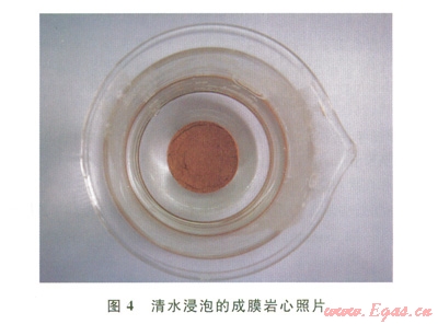 實(shí)驗(yàn)表明:當(dāng)成膜液濃度達(dá)200kg/m3后,巖心在成膜液中浸泡10s就能在表面形成防滲膜(圖1)。因此,從成膜效果和成本考慮,成膜液濃度300~400kg/m3為最優(yōu)加量。