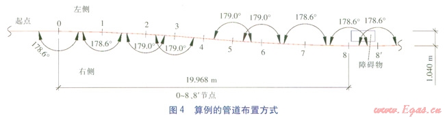 由圖4可知,在節(jié)點(diǎn)0位置管段0—1向右側(cè)偏轉(zhuǎn)1.4°,管段1—2、2—3、3—4繼續(xù)向右側(cè)偏轉(zhuǎn),管段4—5不再偏轉(zhuǎn)(即節(jié)點(diǎn)4的折角為0)。隨即,管段5—6向左側(cè)偏轉(zhuǎn)1.0°,管段6—7、7—8、8—8¢繼續(xù)向左側(cè)偏轉(zhuǎn),管段8—8¢為障礙物所在位置并與管道初始方向平行。采取以上布置方式,沿管道初始方向行進(jìn)19.968m后,整體向右側(cè)偏移1.040m,繞過障礙物(即管段8—8¢所在位置)后,繼續(xù)行進(jìn)19.968m重新回到原管位。求解過程中,管段最短長(zhǎng)度為2m,最大實(shí)際折角為1.4°,滿足限制條件。