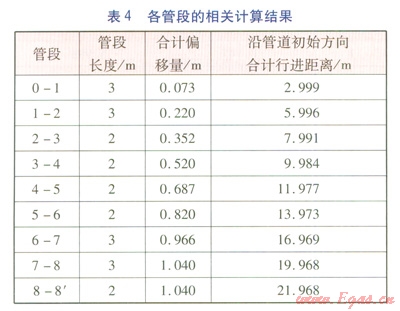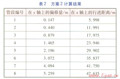 由表1、2可知,若實(shí)現(xiàn)0.879m的y軸上的偏移量,方案2在x軸上僅行進(jìn)17.975m,而方案1需行進(jìn)23.982m。這說(shuō)明,采取縮短管段長(zhǎng)度的方法,有利于在較短的行進(jìn)距離內(nèi)實(shí)現(xiàn)較大的偏移量,從而順利避開障礙物。需要指出的是:在實(shí)際工程中,我們可以采取多實(shí)際折角與多管段長(zhǎng)度相結(jié)合的處理方法,但焊縫數(shù)量不宜過多,以影響施工質(zhì)量。不應(yīng)出現(xiàn)避讓開障礙物后,管道調(diào)整回原管位時(shí)出現(xiàn)實(shí)際折角大于最大允許折角的情況。
