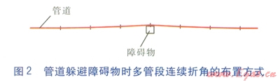 在直埋供熱管道的實(shí)際設(shè)計(jì)與施工中經(jīng)常遇到設(shè)計(jì)路由上有障礙物且無(wú)法移走的情況,因此管道必須局部改變方向(包括水平面、豎直面上的方向改變),避讓障礙物,通過后還需調(diào)整回原路由。由于現(xiàn)場(chǎng)這樣的情況非常多,因此若每遇到這種情況都采用預(yù)制彎管,一方面需要增加大量的預(yù)制彎管數(shù)量,使工程造價(jià)提高;另一方面,定制預(yù)制彎管的時(shí)間很長(zhǎng),延長(zhǎng)了工期,這往往是不可行的。因此,實(shí)際工程中常采用多管段連續(xù)折角的方法處理。管躲避障礙物時(shí)多管段連續(xù)折角的布置方式見圖2。