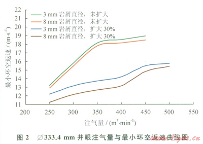 采用最小動(dòng)能法判斷標(biāo)準(zhǔn):l]確定合理灃氣量,該方法認(rèn)為:當(dāng)環(huán)空空氣最小返速不小于15.24m/s時(shí),能將井底產(chǎn)生的巖屑攜帶至地面。根據(jù)實(shí)際鉆屑情況,模擬計(jì)算了Æ431.8mm和Æ333.4mm兩種井眼尺寸,考慮不同井眼擴(kuò)大率,不同巖屑顆粒尺寸條件下的最小環(huán)空返速,參照最小動(dòng)能法判斷標(biāo)準(zhǔn),確定出合理注氣量(表1,圖1、2)。