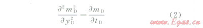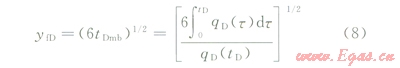 由于探測邊界yfD隨時間而變化,直接求解(2)~(4)并非易事,這里采用近似求解方法。首先對控制方程(2)兩側(cè)先后關(guān)于空間變量(yD)和時間變量(tD)進行積分,利用邊界條件將偏微分方程式(2)轉(zhuǎn)化為探測邊界內(nèi)物質(zhì)平衡方程: