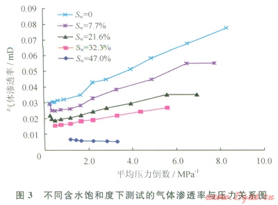 前人研究表明[14-16],致密砂巖中由于復(fù)雜的孔隙結(jié)構(gòu),氣體滲流存在非達西特征。筆者通過氣驅(qū)水實驗分析表明,當驅(qū)替壓差較小時,氣體不能驅(qū)動水形成流動,只有當驅(qū)替壓差大于某一臨界值,足以克服水鎖產(chǎn)生的毛細管阻力才能發(fā)生流動,這在滲流曲線上表現(xiàn)為啟動壓差。對同一巖樣,其含水飽和度越高,氣體始流動所需的驅(qū)動壓差越大,氣體開始流動后,驅(qū)替壓差越大流量越大;巖樣含水飽和度越低,相同驅(qū)替壓差下流量越大。但是,壓差增大滲透率不一定變大,當巖樣含水飽和度較高時,隨著驅(qū)替壓差的增大(平均壓力倒數(shù)減小),氣體滲透率有的增加,有的減小;當巖樣含水飽和度較低時,隨著驅(qū)替壓差的增大(平均壓力倒數(shù)減小),氣體滲透率普遍呈先降低后增加的特點,這是因為前期主要受滑脫效應(yīng)的影響,而后期,當平均壓力倒數(shù)低于一定程度后(即驅(qū)替壓差大于一定值后),這時氣體帶動部分孔隙中的水流動,或使孔隙壁的水膜變薄,氣體滲流通道增加。因此氣體滲透率開始增加(圖3)。含水飽和度越高,這種水的可動性對氣體滲流的影響越明顯。