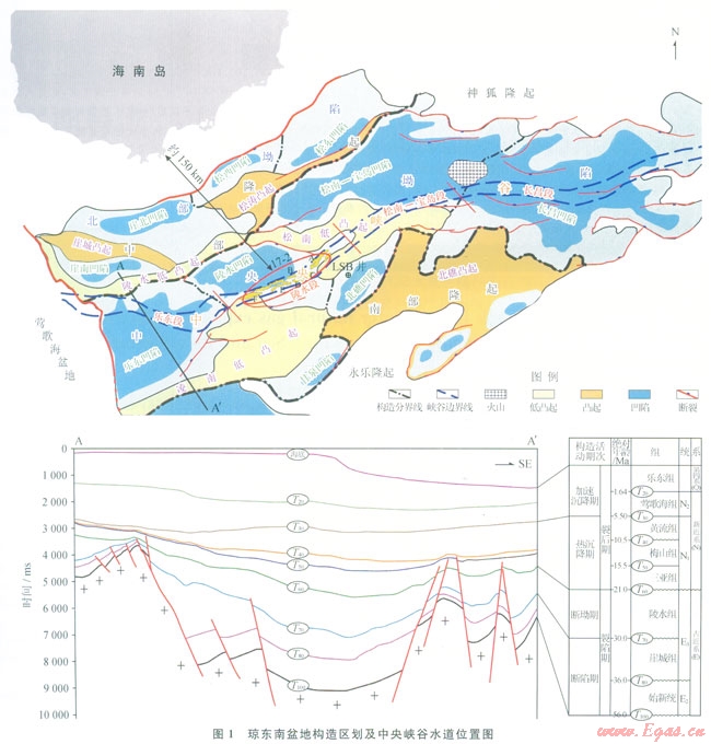 瓊東南盆地位于中國(guó)南海北部大陸邊緣,為新生代斷陷—坳陷盆地。具有準(zhǔn)被動(dòng)大陸邊緣盆地構(gòu)造特征,平面上則表現(xiàn)為南北分帶特征,由北至南可劃分為:北部坳陷、中部隆起、中央坳陷與南部隆起(圖1)。甕地經(jīng)歷由陸到海的演化過程,經(jīng)歷了斷陷期(T100—T70)、斷坳期(T70—T60)、熱沉降期(T60—T30)、加速沉降期(T30—現(xiàn)今)4個(gè)階段,整體可劃分為裂陷期(T100—T60)與裂后期(T60—現(xiàn)今)兩個(gè)時(shí)期,其絕對(duì)地質(zhì)年代如圖1所示,沉積了巨厚的新生代地層,厚度大于12000m[1-3]。