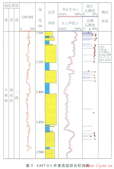 LS17-2-1井于2014年8月18日在新近系上中新統(tǒng)黃流組一段3321~3351m井段進(jìn)行試油,用25.4mm油嘴求產(chǎn),日產(chǎn)氣160×104m4、凝析油78m4,出于海上安全的考慮,沒有進(jìn)一步放大油嘴測(cè)試。測(cè)試結(jié)果表明,氣壓穩(wěn)定,地層能量充足。中海油于2014年9月15日對(duì)外公布了上述成果。