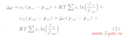 氣體水合反應(yīng)驅(qū)動(dòng)力可定義為氣液系統(tǒng)從某一初始狀態(tài)到另一平衡狀態(tài)的變化過程中摩爾吉布斯自由能變(Dg)的大小。水合反應(yīng)驅(qū)動(dòng)力是當(dāng)Dg>0時(shí),水合物不能生成或水合物生成速度小于分解速度;當(dāng)Dg<0時(shí),水合物可以生成或水合物生成速度大于分解速度。根據(jù)Sloan等[19]給出的等溫氣液系統(tǒng)水合反應(yīng)驅(qū)動(dòng)力公式:
