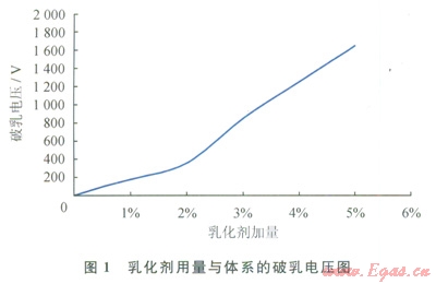 當乳化劑加量大于3%時,體系的破乳電壓增加較快,加量為3%時,體系的破乳電壓達到850V,而當乳化劑加量5%時體系的破乳電壓已經(jīng)達到1650V。考慮當乳化劑加量為3%時,體系的破乳電壓已經(jīng)能夠滿足需要。因此選用乳化劑加量為3%。