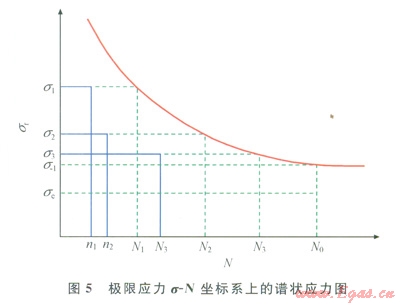 筆者涉及的疲勞破壞就屬于疲勞損傷累積,損傷累積法的理論基礎(chǔ)是Miner法則[8]。Miner法則認(rèn)為:根據(jù)s-N曲線的定義,在恒定應(yīng)力幅(s)的作用下,構(gòu)件運(yùn)轉(zhuǎn)循環(huán)次數(shù)為N時(shí),將產(chǎn)生完全損傷即失效。那么構(gòu)件在應(yīng)力s作用下運(yùn)轉(zhuǎn)一個(gè)比N次數(shù)小的n時(shí),將產(chǎn)生部分損傷,同時(shí)假定在這一過(guò)程中每一次損傷相同,則在s的作用下,損傷概率為n/N,如果一個(gè)構(gòu)件在包含不同應(yīng)力(sj),將產(chǎn)生一個(gè)不同的損傷率nj/Nj,當(dāng)這些損傷概率總和達(dá)到1時(shí),就可以預(yù)測(cè)出現(xiàn)失效,也就是說(shuō):