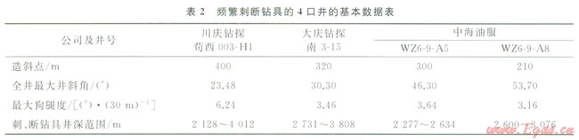 在Æ311.2mm井眼鉆至2128m開(kāi)始,先后發(fā)生了3次Æ127.0mm鉆桿加厚過(guò)渡消失區(qū)刺穿失效,其后又在Æ215.9mm井眼內(nèi)發(fā)生2次Æl27.0mm加重鉆桿中接頭刺穿失效,前后更換2套Æl27.0mm鉆桿無(wú)效,第3次更換Æl27.0mm Sl35×9.19mm大水眼鉆桿,約1個(gè)月后鉆具刺漏現(xiàn)象再次出現(xiàn),并在14d內(nèi)連續(xù)發(fā)生9次幾乎相同的鉆具失效??v觀鉆具失效特征有3個(gè)共性:①失效部位都發(fā)生在距母接頭螺紋臺(tái)肩400~800mm范圍內(nèi),鐓粗帶過(guò)渡消失區(qū);②9次失效中有7次都發(fā)生在距井口400~600m的側(cè)鉆狗腿附近;③9次失效都發(fā)生在Æ215.9mm井眼用PDC鉆進(jìn)工藝過(guò)程中,最高轉(zhuǎn)速達(dá)90r/min(圖1)。表2是收集到的幾起類(lèi)似鉆具失效井的相關(guān)數(shù)據(jù)。