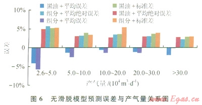 無滑脫模型各項誤差次之(圖4),組分模型計算誤差大于黑油模型,是由于Govier-Fogarasi用的凝析氣井液氣比為0.05~14.4m3/104m3,從黑油模型對所選模型(無滑脫、Gray和Hagedorn&Brown沒有劃分流型)計算流型看:Mukherjee&Brill和Orkiszewski所有井井簡全部為段塞流,Hasan&Kabir預(yù)測結(jié)果除5井次出現(xiàn)分散泡狀流以外,其余井全為環(huán)狀流。段塞流為一段氣一段液,而環(huán)狀流主要靠氣相中攜帶的液滴和氣相與管壁液膜的摩擦帶液。因此兩種流型的滑脫損失均較小,可以采用無滑脫模型計算壓降。從分段液氣比看,液氣比小于0.5m3/104m3,誤差較大,這主要是由于氣液比極高,舉升壓降極小,13口壓降梯度平均為1.74MPa/1000m,導(dǎo)致井底流壓(13口井底流壓平均13.4MPa)較小,即使計算的井底流壓誤差較小因井底流壓測壓值較小而誤差較大。隨著液氣比的增加,各項誤差逐漸增加(圖5)?,F(xiàn)考慮各項誤差限為5%,采用無滑脫模型的液氣比范圍為0.5~5m3/104m3,并對該氣液比條件下的產(chǎn)氣量進(jìn)行了分段統(tǒng)計如圖6所示,隨著產(chǎn)氣量的增加,各項誤差逐漸下降。因此無滑脫模型按黑油計算適用條件為:液氣比0.5~5m3/104m3,產(chǎn)氣量大于5×104m3/d,井底流壓誤差小于5%。