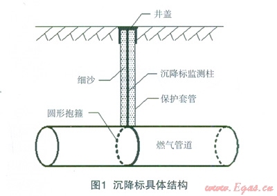 為掌握埋地燃氣管道的沉降信息,結(jié)合燃氣管道施工,在管道頂部安裝了沉降標進行監(jiān)測?,F(xiàn)場沉降標由圓形抱箍、不銹鋼監(jiān)測柱、保護套管及井蓋構(gòu)成,圓形抱箍圍住管道并用螺絲同定,不銹鋼監(jiān)測柱焊接在抱箍正上方并伸出至接近地面,監(jiān)測柱外側(cè)設置保護套管,套管頂部設有保護井蓋。沉降標具體結(jié)構(gòu)見圖1,通過對不銹鋼柱沉降的測量反映管道的沉降。