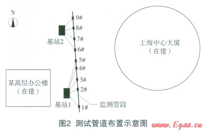 監(jiān)測管段位于上海中心大廈與另一座正在施工的建筑之間,屬于地面沉降危險地段,為防止天然氣管道在建筑施工期間發(fā)生破壞,決定進行天然氣管道的更換,9根試驗管段也作為更新管道的一部分接入整個管線,監(jiān)測管道以及周同主要建筑物的相對位置如圖2所示。