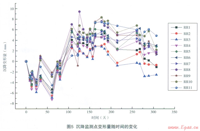 整個實驗系統(tǒng)安裝完畢后即開始運行,截至目前的300天時間內(nèi),沉降數(shù)據(jù)的采集頻率由人工操作,大約為20天1次,各沉降監(jiān)測點的監(jiān)測結(jié)果如圖5。