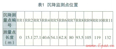 整個測試管道沉降測量點的編號與水平方向的長度見表1所示。