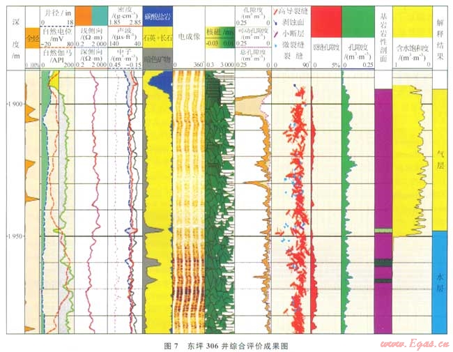 氣層與干層的確定是以孔隙度大大小進(jìn)行劃分的。核磁資料表明當(dāng)孔隙度為2%時(shí),可動(dòng)流體只有1%,同時(shí)參考了國(guó)內(nèi)外眾多的古潛山油氣藏,以孔隙度2%作為有效儲(chǔ)層的下限。據(jù)前述方法對(duì)區(qū)塊內(nèi)的井進(jìn)行了綜合評(píng)價(jià),如圖7所示為東坪306井的評(píng)價(jià)成果圖。該井1894.5m以下為花崗巖,電成像表明高導(dǎo)裂縫非常發(fā)育,裂縫孔隙度分布在0.05%~0.5%之間,總孔隙度為6.2%,計(jì)算的含氣飽和度為70%,深、淺側(cè)向有小的正差異氣測(cè)錄井顯示較好(中部因取心氣測(cè)低),解釋為氣層;下部巖性、物性與上部相當(dāng),但電阻率明顯降低,且深、淺側(cè)向基本重合,氣測(cè)無(wú)顯示,解釋為水層,據(jù)此確定了氣水界面。其數(shù)據(jù)為:井段1894.5~1950.0m,電阻率20~100W·m,核磁可動(dòng)孔隙度3.2%,溶蝕孔隙度6.2%,裂縫走向NWSE,裂縫孔隙度0.02%~0.50%,含氣飽和度70%,解釋為氣層;井段1950.0~2097.3m,電阻率4~80W·m,核磁可動(dòng)孔隙度1.5%,溶蝕孔隙度4.0%,裂縫走向NWSE,裂縫孔隙度0.05%~0.80%,含氣飽和度為0,解釋為水層。