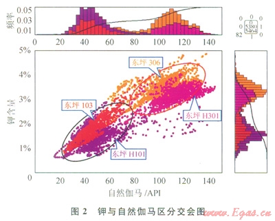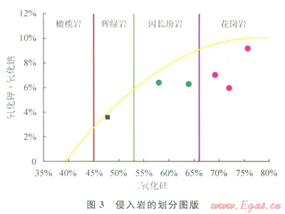 儲(chǔ)層巖性識(shí)別是油氣藏評(píng)價(jià)的前提和基礎(chǔ)工作,與常見(jiàn)的沉積巖不同的是基巖巖性復(fù)雜多變,測(cè)井識(shí)別困難。地面露頭踏勘和鉆井巖心分析表明東坪氣田的基巖包括火成巖和變質(zhì)巖兩大類(lèi)巖性(圖1),北部3井區(qū)基巖以侵入巖為主,南部1井區(qū)以變質(zhì)巖為主。研究表明侵入巖主要為花崗巖,中間夾有輝綠巖、閃長(zhǎng)玢巖的巖脈。變質(zhì)巖可分為3大類(lèi),分別為花崗片麻巖、斜長(zhǎng)片麻巖和鈣質(zhì)片麻巖。侵入巖和變質(zhì)巖的區(qū)分可利用鉀和自然伽馬的交會(huì)圖(圖2)。由于侵入巖以鉀長(zhǎng)石含量較高的花崗巖為主,其鉀含量和自然伽馬為相對(duì)高值,變質(zhì)巖的鉀和自然伽馬相對(duì)低值。因此侵入巖位于交會(huì)圖的右上角而變質(zhì)巖位于交會(huì)圖的左下方。利用元素俘獲譜資料實(shí)現(xiàn)兩大類(lèi)巖性的細(xì)分。二氧化硅與氧化鈉和氧化鉀之和的交會(huì)圖(圖3)實(shí)現(xiàn)侵入巖的細(xì)分,花崗巖的二氧化硅含量高,為66%,輝綠巖為45%~53%,閃長(zhǎng)玢巖為53%~66%。據(jù)此實(shí)現(xiàn)了北部3井區(qū)基巖儲(chǔ)層巖性的識(shí)別與劃分。變質(zhì)巖的種類(lèi)繁多且其成因復(fù)雜,因而變質(zhì)巖的識(shí)別與劃分相對(duì)侵入巖要復(fù)雜得多。通常認(rèn)為在變質(zhì)巖的形成過(guò)程中化學(xué)成分穩(wěn)定,這為利用元素俘獲譜測(cè)井劃分巖性提供了有利條件,同時(shí)由于礦物成分的不同其密度與中子值也有所不同。因此常規(guī)曲線對(duì)巖性的劃分也提供了好的資料。