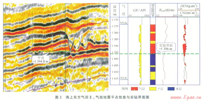 研究表明,在一定的地質(zhì)條件下砂體含氣后在地震資料上表現(xiàn)為明顯的“亮點(diǎn)”效應(yīng),氣層的振幅異常能較好地反映砂體的含氣情況川。在鶯歌海盆地的多個(gè)淺層氣藏實(shí)際鉆井資料證實(shí),鉆在振幅“亮點(diǎn)”范圍內(nèi)的井,其目的層均含氣。低部位如受氣水界面控制,同一種地震屬性在氣水邊界之上和之下表現(xiàn)出來(lái)的響應(yīng)有很大差異,形成“平點(diǎn)”現(xiàn)象,根據(jù)該平點(diǎn)信息可確定氣水界面。測(cè)井解釋結(jié)果也證實(shí)該界面是可靠的。如圖2所示,東方氣田的Ⅱ上氣組,根據(jù)平點(diǎn)信息確定的氣水界面為海拔-1394.6m,根據(jù)該界面圈定的含氣范圍內(nèi)有明顯的“亮點(diǎn)效應(yīng)”,實(shí)際井鉆遇的氣水界面為海拔-1396.0m,證實(shí)在該區(qū)域可以依據(jù)三維地震資料的亮點(diǎn)效應(yīng)和平點(diǎn)現(xiàn)象來(lái)確定氣水界面,從而確定氣田的含氣面積。該方法可以應(yīng)用在沒(méi)有實(shí)鉆界面的其他氣組或鄰近相似氣田,來(lái)彌補(bǔ)海上氣田鉆井工作量相對(duì)少引起資料不足的缺陷。
