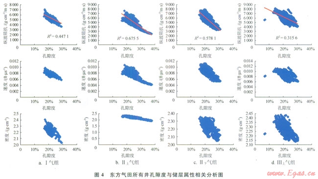 在進(jìn)行儲(chǔ)層孔隙度橫向描述之前,需要進(jìn)行了大量的儲(chǔ)層物性研究工作。研究的目的是通過(guò)分析儲(chǔ)層物性和與地震資料有直接關(guān)系的儲(chǔ)層的速度、密度和波阻抗等地震屬性的相關(guān)關(guān)系,來(lái)建立起合理的井震關(guān)系[14]。中海石油(中國(guó))有限公司湛江分公司西部東方氣田各氣組單井孔隙度與地震的波阻抗、速度和密度都有一定的相關(guān)性。圖4為東方氣田多井分氣組進(jìn)行的孔隙度與地震的波阻抗、速度和密度的相關(guān)分析結(jié)果,從圖4上可以看出各氣組儲(chǔ)層的孔隙度與這幾種地震屬性有較好的相關(guān)關(guān)系,其中Ⅱ上氣組孔隙度和波阻抗的相關(guān)關(guān)系高達(dá)0.82,這說(shuō)明東方氣田儲(chǔ)層的孔隙度與地震屬性有較好的相關(guān)性。因此,可以利用與地震屬性的相關(guān)性預(yù)測(cè)儲(chǔ)層孔隙度的方法來(lái)描述孔隙度的橫向變化。通過(guò)抽井檢驗(yàn)和儲(chǔ)量對(duì)比等方式檢查認(rèn)為各個(gè)氣組的孔隙度預(yù)測(cè)結(jié)果均為合理結(jié)果(圖5)。