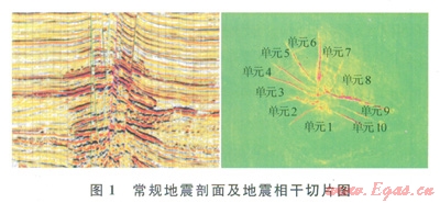 要確保儲(chǔ)量計(jì)算結(jié)果的精度,就必須從縱向上、平面上對(duì)儲(chǔ)量計(jì)算單元進(jìn)行細(xì)分。地震相十體技術(shù)能夠幫助更好地識(shí)別斷層,有助于合理、精細(xì)劃分儲(chǔ)量計(jì)算單元,該項(xiàng)技術(shù)利用地震信號(hào)相干值的變化來(lái)描述地層、巖性等的橫向非均勻性,有利于研究斷層、微斷裂的空間分布,地質(zhì)構(gòu)造異常及巖性的整體空間展布特征[9]。地震波同相軸發(fā)生錯(cuò)動(dòng)或波形橫向變化,都使相干數(shù)值發(fā)牛明顯變化,在相干切片上可直觀顯示斷層,從而確定平面上的儲(chǔ)量計(jì)算單元,并結(jié)合鉆井情況和地質(zhì)認(rèn)識(shí)確定各單元的儲(chǔ)量級(jí)別[10]。圖1是海上樂(lè)東15氣田常規(guī)地震剖面及地震相干切片圖,根據(jù)其對(duì)斷層的識(shí)別,共劃分了10個(gè)計(jì)算單元,探、評(píng)價(jià)井信息表明,各計(jì)算單元?dú)怏w組分差異大,相干體技術(shù)識(shí)別斷層后可以更加細(xì)分儲(chǔ)量計(jì)算單元,根據(jù)各計(jì)算單元的氣體組分、儲(chǔ)量的不同,從而在開(kāi)發(fā)實(shí)施的過(guò)程中優(yōu)化開(kāi)發(fā)井井位,優(yōu)先開(kāi)發(fā)純烴含量高的計(jì)算單元,針對(duì)儲(chǔ)量大的區(qū)塊合理部署開(kāi)發(fā)井?dāng)?shù),為高效、合理地利用天然氣資源奠定了基礎(chǔ)。