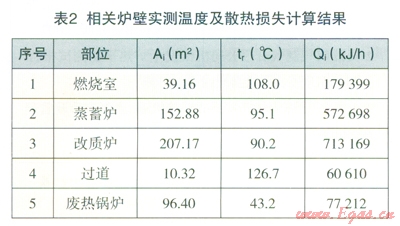 吳煤公司的天然氣改質(zhì)爐是常壓改質(zhì)爐,該工藝過(guò)程的熱效率76.37%,生產(chǎn)城市燃?xì)庑?span lang="EN-US">84.74%。對(duì)照國(guó)內(nèi)常壓改質(zhì)爐生產(chǎn)數(shù)據(jù),屬于較好水平生產(chǎn)燃?xì)?。這種能源轉(zhuǎn)換設(shè)備不同于其他燃?xì)馍a(chǎn)設(shè)備,無(wú)固體灰渣排出,因此,熱量損失評(píng)價(jià)可以從排煙熱損失(顯熱損失和化學(xué)不完全燃燒熱損失)及爐肇散熱損失進(jìn)行考察。測(cè)試數(shù)據(jù)顯示,僅有部分爐體外壁溫度有所偏高,較易克服以減少熱量損失。從占熱量損失的比值來(lái)看分別為機(jī)械發(fā)生爐為45%,鍋爐為59.53%,天然氣改質(zhì)爐為18.52%,由此可見(jiàn),天然氣改質(zhì)爐的能源轉(zhuǎn)換和熱量利用最好。