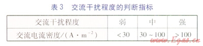 GB/T 50698—2011《埋地鋼質(zhì)管道交流干擾防護(hù)技術(shù)標(biāo)準(zhǔn)》中第3.0.5條規(guī)定:“當(dāng)管道上的交流干擾電壓不高于4V時(shí),可不采取交流干擾防護(hù)措施;高于4V時(shí),應(yīng)采用交流電流密度進(jìn)行評(píng)估。”高于4V時(shí)的交流干擾程度的判斷指標(biāo)參照GB/T 50698—2011《埋地鋼質(zhì)管道交流干擾防護(hù)技術(shù)標(biāo)準(zhǔn)》中3.0.6條(見(jiàn)表3)。