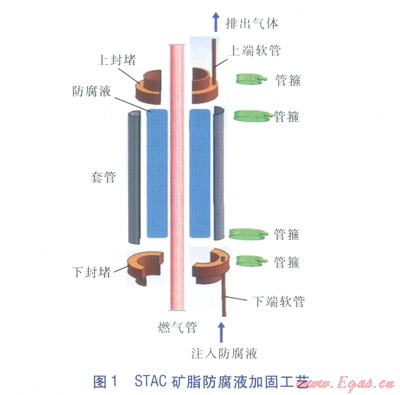 具體施工方案見圖1。首先在燃?xì)饬⒐艽┰綁痛前逄幖犹坠?/span>(由2部分拼合而成),套管上下端邊緣處追加管箍(用于固定套管)并安裝上下封堵,套管上下封堵安裝好后分別追加管箍(用于固定封堵);分別將2段軟管插入上下封堵的注液孔中,通過(guò)下端軟管向套管和燃?xì)饬⒐苤g注入STAC礦脂防腐液(以下簡(jiǎn)稱防腐液),最后對(duì)軟管進(jìn)行封口。