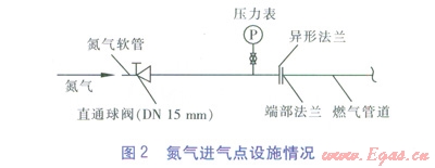 ②現(xiàn)場準(zhǔn)備:核實(shí)現(xiàn)場的管道、閥門位置,通過開關(guān)閥門,了解每個閥門是否有效,清楚閥門是否有內(nèi)漏情況(通過閥門開關(guān)及管段壓力變化試驗(yàn)來確定)。對于關(guān)鍵閥門,如發(fā)現(xiàn)內(nèi)漏或失效情況,要在停氣后更換,為之后的置換做準(zhǔn)備。停氣后將氮?dú)膺M(jìn)氣點(diǎn)設(shè)施按要求安裝。