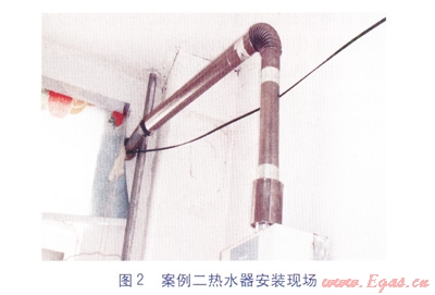 事故燃氣熱水器排氣管安裝不符合GB 6932—2001《家用燃氣快速熱水器》附錄A《家用燃氣快速熱水器安裝技術要求》A4.1.3中防倒風罩以上的排氣管室內(nèi)垂直部分不得小于250mm以及排氣管頂端必須安裝有效的防風、雨、雪的風帽的要求。此種情況下,極易出現(xiàn)在使用熱水器時,由于煙道排氣不暢,甚至出現(xiàn)倒風,致使燃氣燃燒產(chǎn)生的煙氣不能有效排到室外。
