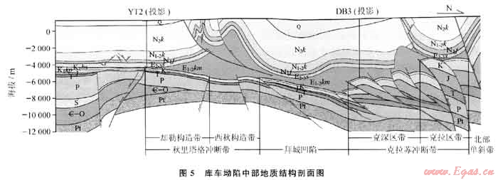 克深區(qū)帶是克拉蘇構(gòu)造帶的又一個(gè)次級構(gòu)造單元,呈NEE向條帶狀展布,東西長約190km,南北最寬約17km。北側(cè)以克拉蘇斷裂為邊界,位于克拉區(qū)帶的下盤;南側(cè)以拜城斷裂為界,與拜城凹陷相接。拜城斷裂是克拉蘇構(gòu)造帶的南邊界斷裂,規(guī)模、性質(zhì)、斷開層位與克拉蘇斷裂相同。與克拉蘇斷裂相比,拜城斷裂斷距變小,最大垂直斷距約為2000m,斷面較緩,該斷裂控制克深區(qū)帶的南邊界??松顓^(qū)帶還發(fā)育多條與克拉蘇斷裂、拜城斷裂近于平行的次級斷裂,斷裂性質(zhì)與兩邊界斷裂相似,規(guī)模相對較小,多條次級斷裂與2條邊界斷裂共同決定了克深區(qū)帶的構(gòu)造樣式(圖4、5)。