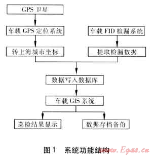 利用公司現(xiàn)有的數(shù)據(jù)和軟件平臺,將車載FID、車載GPS、GIS信息系統(tǒng)三者相結(jié)合,構(gòu)建起市北公司燃氣管網(wǎng)泄漏的早期預(yù)警系統(tǒng)。其工作原理為FID檢漏儀檢測到管網(wǎng)泄漏點后,系統(tǒng)將完成兩項任務(wù),一方面自動讀取車載檢漏儀所采集到的數(shù)據(jù),將其寫入數(shù)據(jù)庫;另一方面,安裝在檢漏車上的GPS定位儀自動記錄泄漏點的空間坐標,并轉(zhuǎn)換為上海城市坐標,供安裝于車載筆記本電腦上的GIS系統(tǒng)使用。GIS系統(tǒng)將GPS傳送的空間坐標以及FID采集到的泄漏數(shù)據(jù)整合,進行專業(yè)分析、專題顯示,形成相關(guān)的報告報表。圖1表示了整個系統(tǒng)的功能結(jié)構(gòu)。