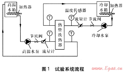 液-液熱管換熱器的試驗(yàn)裝置包括高溫水系統(tǒng)、冷卻水系統(tǒng)、數(shù)據(jù)采集系統(tǒng)。高溫水系統(tǒng)包括高溫水箱、可調(diào)功率加熱器、高溫水泵、流量調(diào)節(jié)裝置(節(jié)流閥)。冷卻水系統(tǒng)包括冷卻水箱、可調(diào)功率加熱器、冷卻水泵、流量調(diào)節(jié)裝置(節(jié)流閥)。數(shù)據(jù)采集系統(tǒng)主要包括轉(zhuǎn)子流量計(jì)、溫度傳感器。熱管換熱器的外殼為開式,可更換熱管,外殼覆蓋絕熱層,減少熱損耗,提高試驗(yàn)精度。試驗(yàn)系統(tǒng)流程見圖1。
