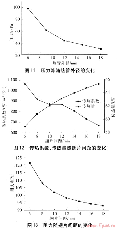 可以看出,翅片厚度對(duì)熱管的傳熱系數(shù)和傳熱量影響很小,但對(duì)阻力影響影響較大。翅片越薄,流動(dòng)阻力越小。因此,應(yīng)盡可能選擇較薄的翅片。但翅片厚度的選取還要從機(jī)械強(qiáng)度、制造工藝以及耐腐蝕等方面進(jìn)行考慮。