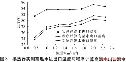 換熱器高溫水進(jìn)出口溫度與程序計(jì)算高溫水出口溫度見圖3。由圖3可知,當(dāng)高溫水流量在0.75~2.25m3/h變化時(shí),實(shí)測(cè)的高溫水出口溫度與程序計(jì)算值的變化趨勢(shì)基本是一致的,但實(shí)測(cè)值比程序計(jì)算值低,即換熱器的實(shí)際傳熱量比程序計(jì)算的高。