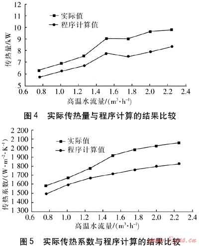 采用另外4種工況下的試驗(yàn)數(shù)據(jù)驗(yàn)證了修正后模型的精確性,對(duì)比結(jié)果表明,修正后的程序計(jì)算結(jié)果與試驗(yàn)結(jié)果基本吻合,高溫水出口溫度的最大偏差為0.2℃,是實(shí)測(cè)溫度的3.17%;傳熱量的最大偏差為0.22kW,是實(shí)測(cè)傳熱量的3.18%。