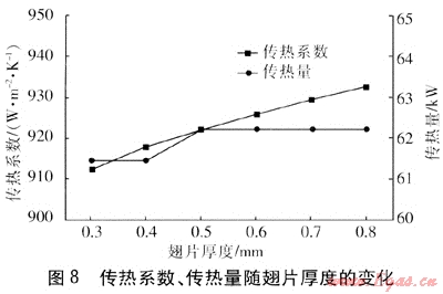 在翅片間距為10mm、蒸發(fā)側(cè)、冷凝側(cè)長(zhǎng)度分別為100mm、熱管外徑為6mm、熱管壁厚為0.5mm、熱管間距為8.5mm時(shí),機(jī)油冷卻器性能隨翅片厚度的變化見圖8、9。由圖8可知,隨著翅片厚度增加,傳熱系數(shù)有少許增加,傳熱量基本不受影響。這是由于翅片厚度增加使得機(jī)油的流通面積減小,流速增加,傳熱系數(shù)也隨之增大。同時(shí)傳熱面積減少,傳熱量變化不大。由圖9可知,隨著翅片厚度的增加,機(jī)油流通面積減小,機(jī)油的流速增加,因此蒸發(fā)側(cè)的阻力增大。
