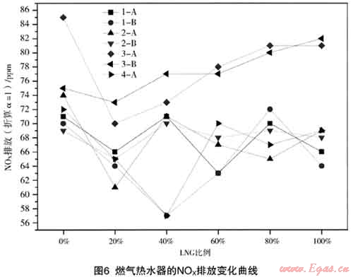 (1) 熱水器熱負(fù)荷增加,熱效率降低,CO排放增加,N0x無濕著變化;