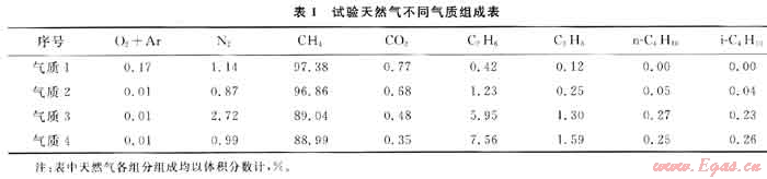 為了考察不同氣質(zhì)天然氣組成條件對部分氧化反應(yīng)的影響,選擇了4種氣質(zhì)條件進(jìn)行試驗(yàn),其組成分別如表1所示。