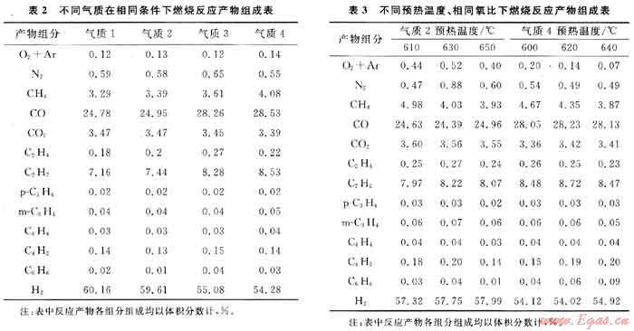 為了考察不同氣質(zhì)對燃燒反應(yīng)的影響,所有試驗(yàn)樣品在相同工況下進(jìn)行反應(yīng):天然氣流量為4700m3/h,預(yù)熱溫度為625℃,氧比為0.575,熱淬火水用量為39m3/h,冷淬火水用量為35m3/h。