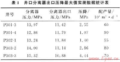 普光氣田開(kāi)發(fā)井生產(chǎn)后,8臺(tái)井口分離器都頻繁出現(xiàn)過(guò)出口壓差過(guò)大的現(xiàn)象,其中5臺(tái)最嚴(yán)重,壓降最高時(shí)達(dá)4.44MPa,井口分離器出口壓降最大值實(shí)測(cè)數(shù)據(jù)統(tǒng)計(jì)表見(jiàn)表1。